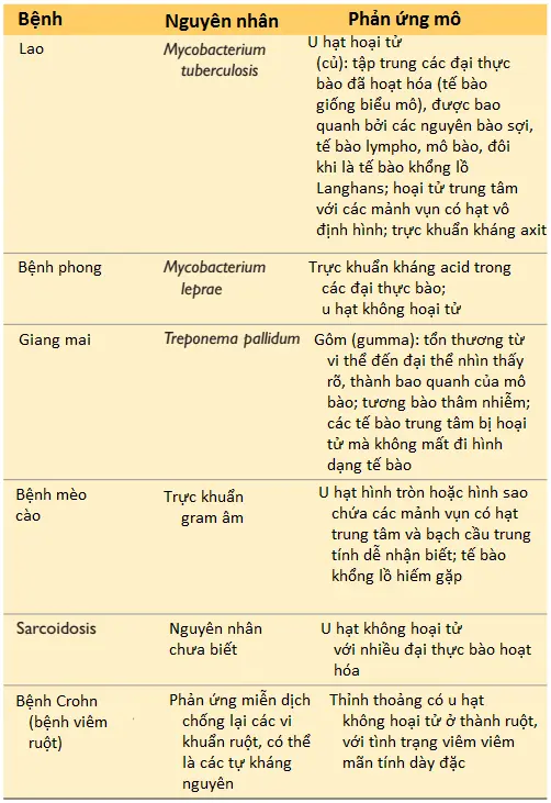 Việc nhận biết viêm u hạt là quan trọng vì số lượng các tình trạng gây ra bệnh này (một số trường hợp đe dọa tính mạng) còn hạn chế (Bảng 1). Bệnh lao là một nguyên mẫu (prototype) của bệnh u hạt do nhiễm trùng và phải luôn được loại trừ là nguyên nhân khi xác định được u hạt. Trong bệnh này, u hạt được gọi là bệnh lao. U hạt cũng có thể phát triển trong một số bệnh lý viêm qua trung gian miễn dịch. Đáng chú ý trong số này là bệnh Crohn, một loại bệnh viêm ruột và là nguyên nhân quan trọng gây viêm u hạt ở Hoa Kỳ, và bệnh sarcoidosis, một chứng rối loạn không rõ nguyên nhân. Các mô hình hình thái trong các bệnh u hạt khác nhau có thể khác nhau đủ để cho phép chẩn đoán chính xác một cách hợp lý bởi một nhà nghiên cứu bệnh học có kinh nghiệm (xem Bảng 3.9); tuy nhiên, có rất nhiều biểu hiện không điển hình nên luôn cần phải xác định tác nhân gây bệnh cụ thể bằng các phương pháp nhuộm đặc biệt dành cho sinh vật (ví dụ: nhuộm kháng axit đối với trực khuẩn lao), bằng phương pháp nuôi cấy (ví dụ: trong bệnh lao và bệnh nấm), bằng phương pháp kỹ thuật phân tử (ví dụ, phản ứng chuỗi polymerase trong bệnh lao) và bằng các nghiên cứu huyết thanh học (ví dụ, trong bệnh giang mai).